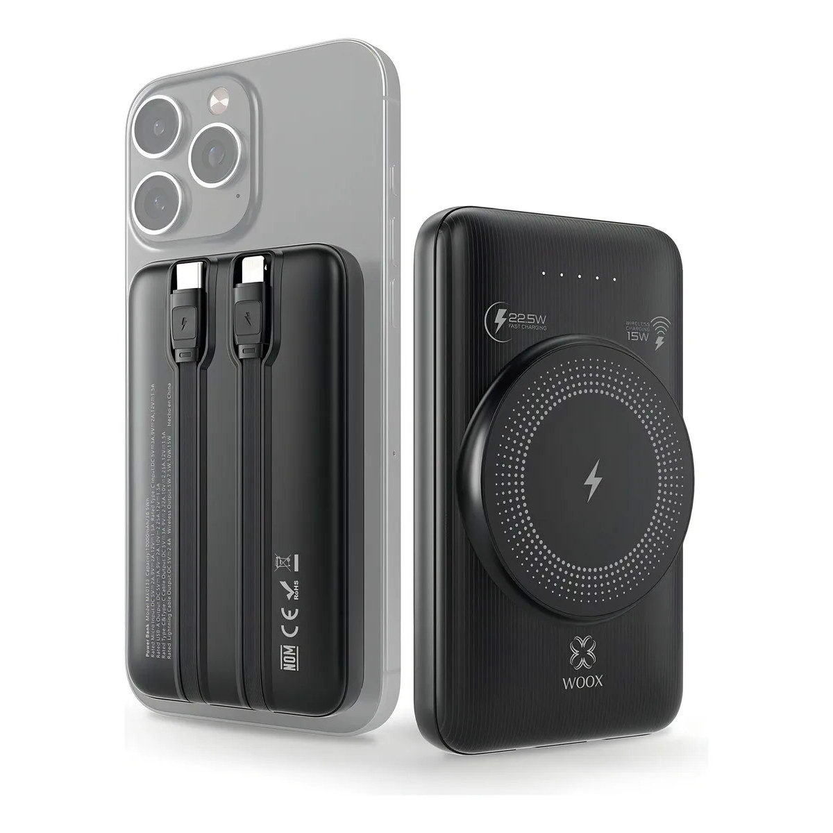 The Woox MX0133 Wireless powerbank is a 10,000ma portable charger with enough power to fully charge most modern phones 2 to 3 times. Features built in cables to fit USB-C and Lightning connectors. Supports wireless charging with built in magnets to keep your phone in the correct place (requires Magsafe or Pixelsnap compatible handset)