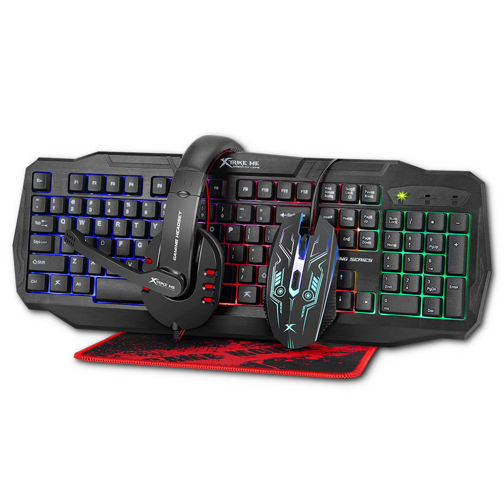 4-in-1 gaming set featuring USB keybaord, mouse, headset and mouse mat. Take your gaming setup to the next level